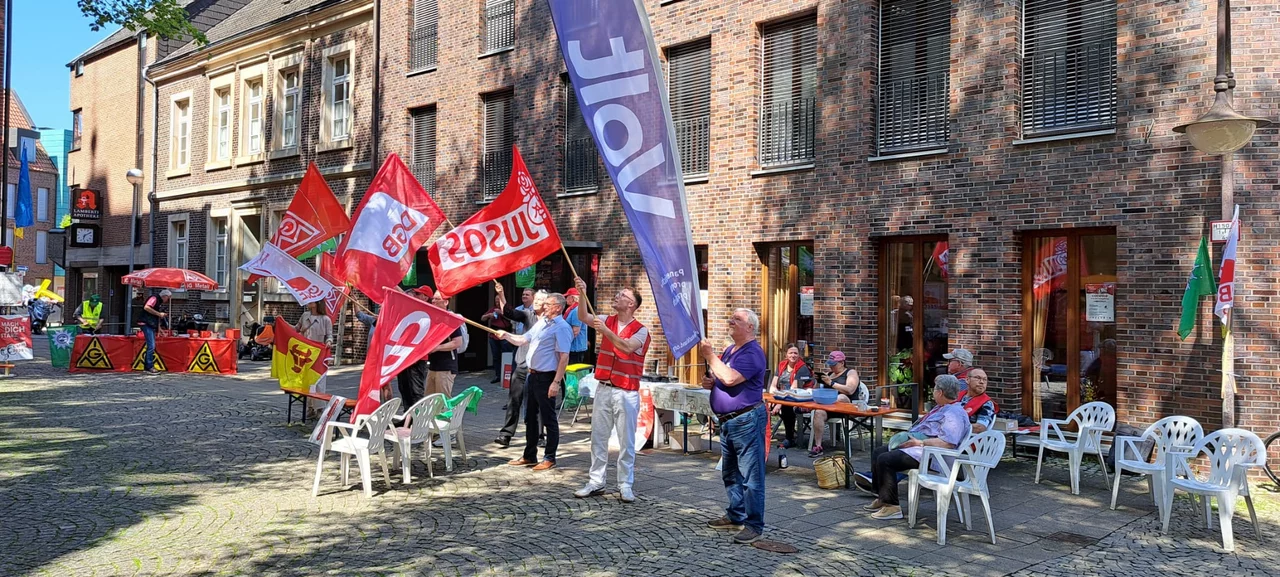 Links: Wahlstand in der Kupferstraße mit der stellvertretenden Volt Landesvorsitzenden Frances Noltekuhlemann. (3 von links) und natürlich wieder mit Wahlhilfe von Volt Niederlande.
