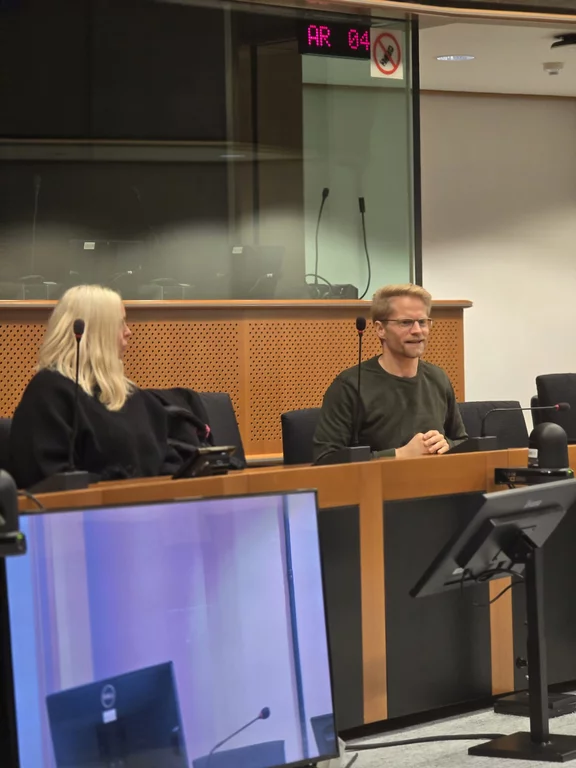 Links: Volt Europa Parlamentarier Kai Tegethoff erklärt seine Arbeit im Parlament u.a. im Ausschuss für Verkehr und Fremdenverkehr