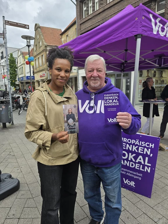 Rechts: Amtshilfe aus Brüssel. Unsere Volt Europa Abgeordnete und Sprecherin für Bildung und Kultur im EU-Parlament, Nela Riehl, hat mit Ortsleiter Coesfeld Franz Lenhard Werbung für Eliza Diekmann-Cloppenburg gemacht. Den Flyer hat sie mit nach Brüssel genommen.