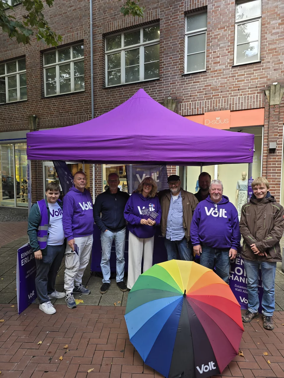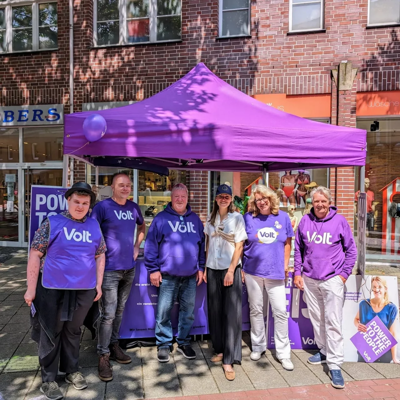 Wahlstand in der Kupferstraße mit der stellvertretenden Landesvorsitzenden und NRW Spitzenkandidatin Frances Noltekuhlemann 3. von links und wieder mit Niederländischer Volt Beteiligung.