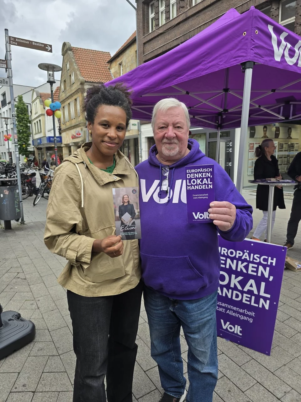 Wahlhilfe aus Brüssel. Unsere Volt Europaabgeordnete und Vorsitzende des Ausshusses für Bildung und Kultur im EU Parlament, Nela Riehl, macht gemeinsam mit Volt-Ortsleiter Franz Lenhard, Werbung für Eliza Diekmann-Cloppenburg.