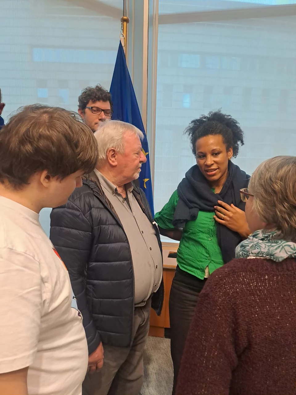 Gruppenbild mit Nela Riehl (Mitte) und 3 Fraktions-Mitgliedern von Volt Coesfeld und anderen Fraktionen bzw. engagierten Voltis aus dem Münsterland und Volt-Teamleiterin Nanda, Achterhoek NL. (Nanda 3. von links)