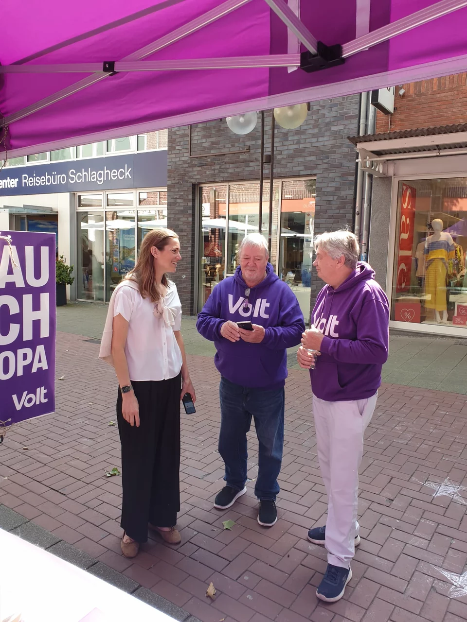 Bürgermeisterin Eliza Diekmann-Cloppenburg im Gespräch mit Ortsleiter Franz Lenhard und Volt Mitglied Sjoerd Nijhuis aus dem Volt-Team Twente Enschede (NL)